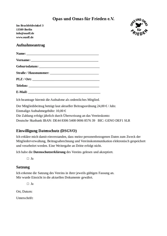 Das Aufnahmeantragsformular und die Satzung des Vereins erhalten Sie auf Anfrage an info@ouoff.de als pdf-Datei.